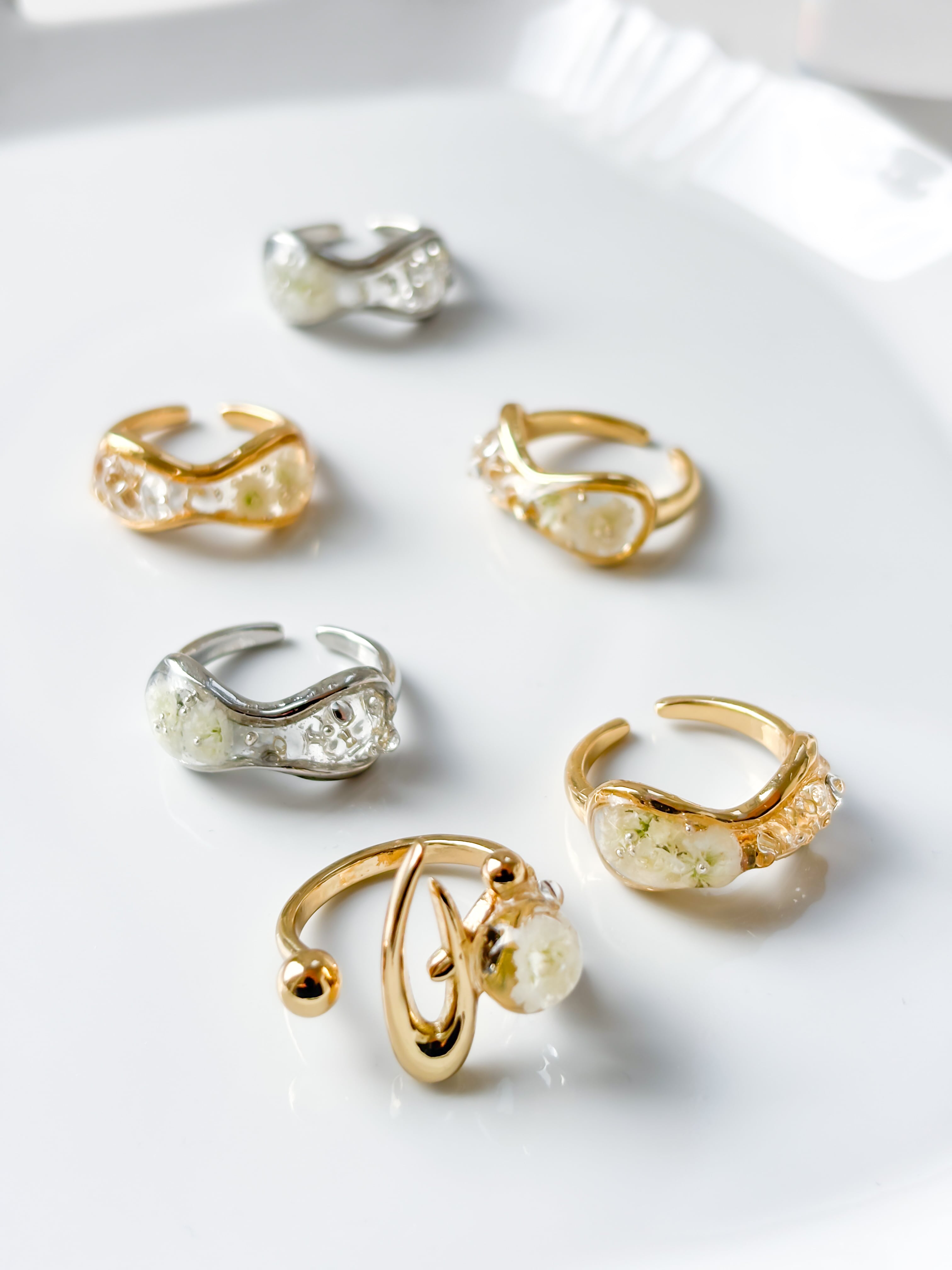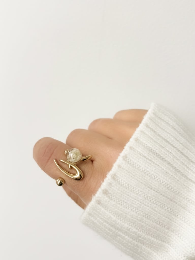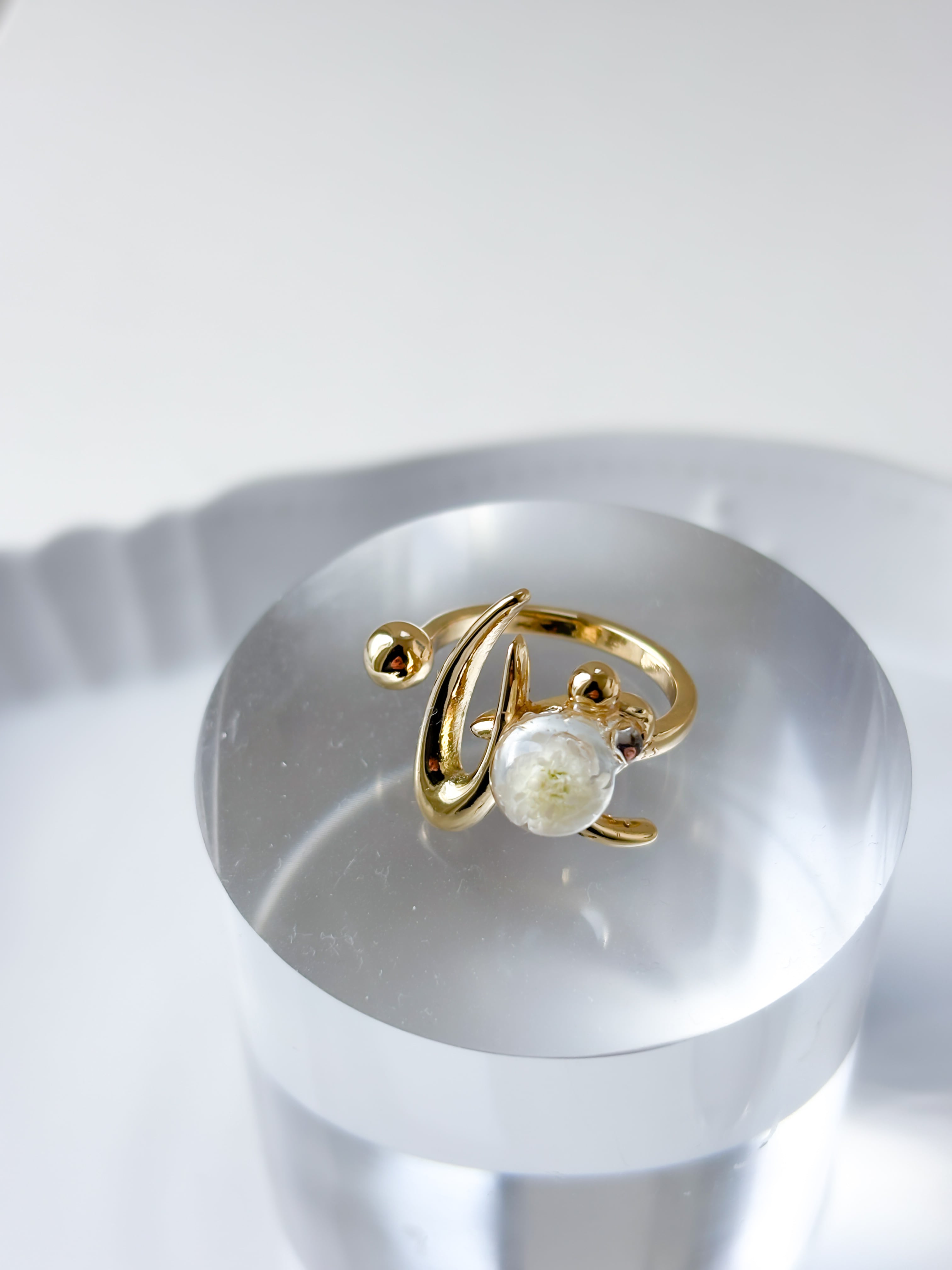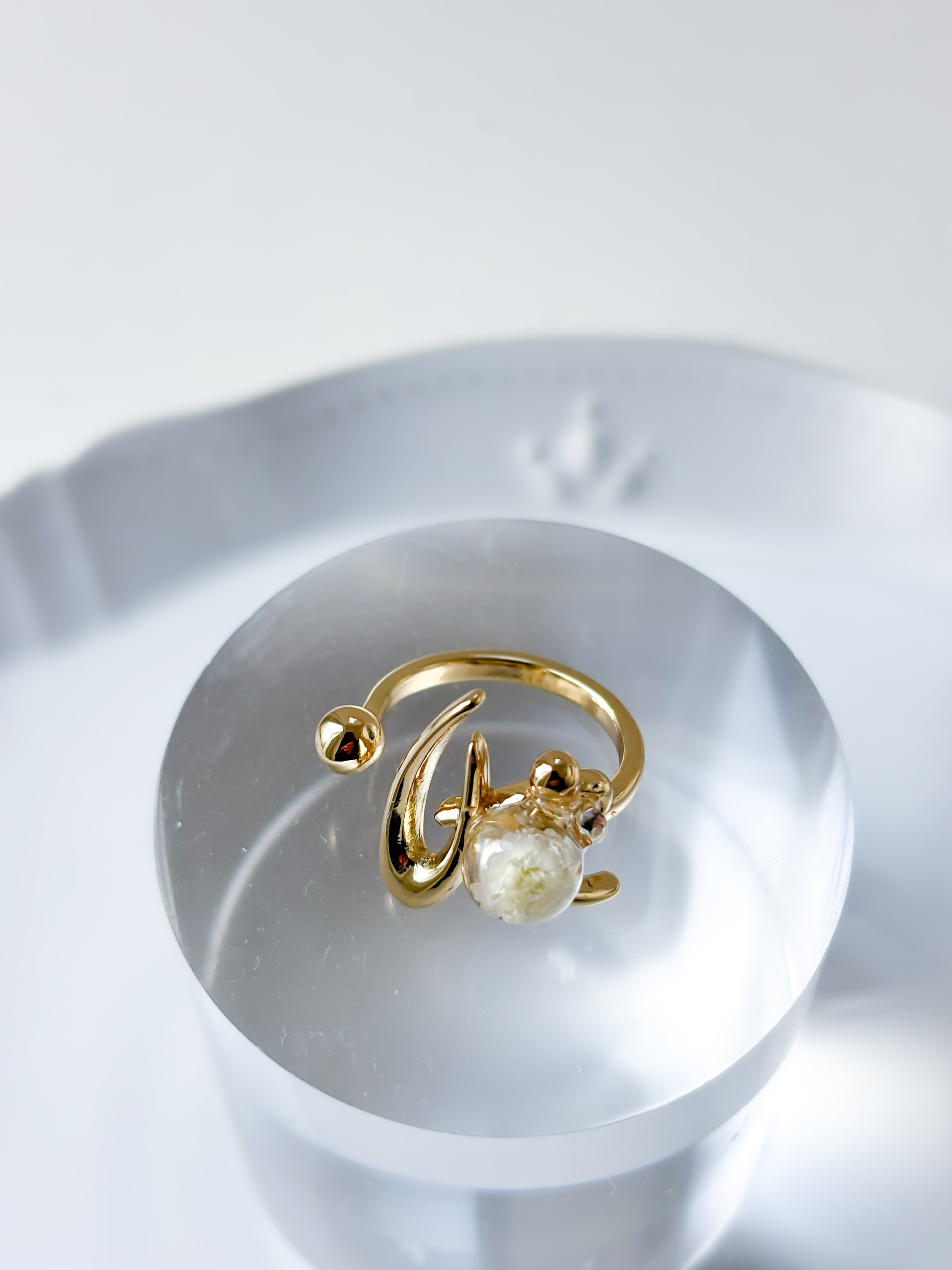 幸福という花言葉を持つ、かすみ草を閉じ込めたリング。